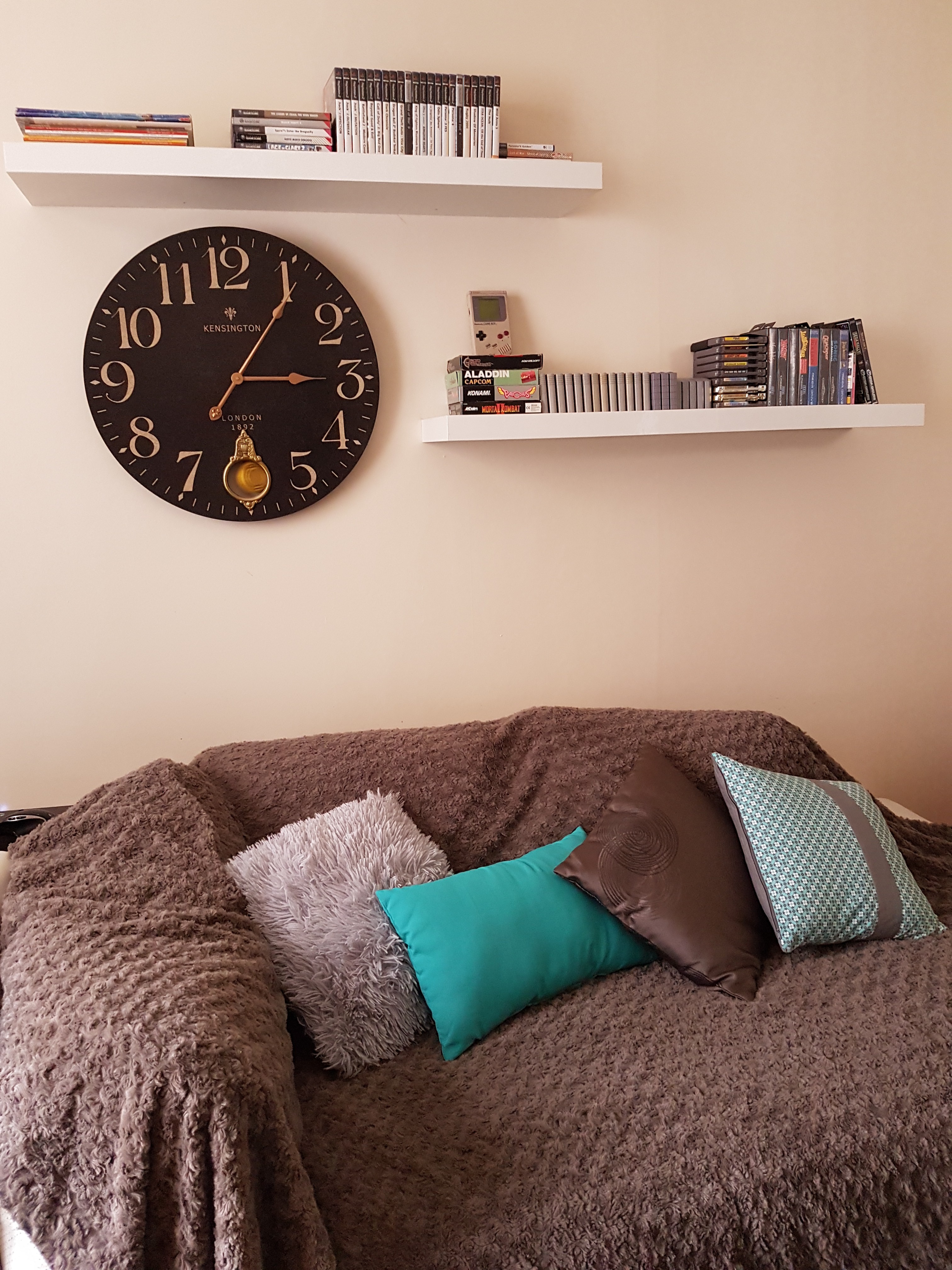 Au-dessus du canapé, les anciennes générations Nintendo, Sega et Playstation se côtoient.