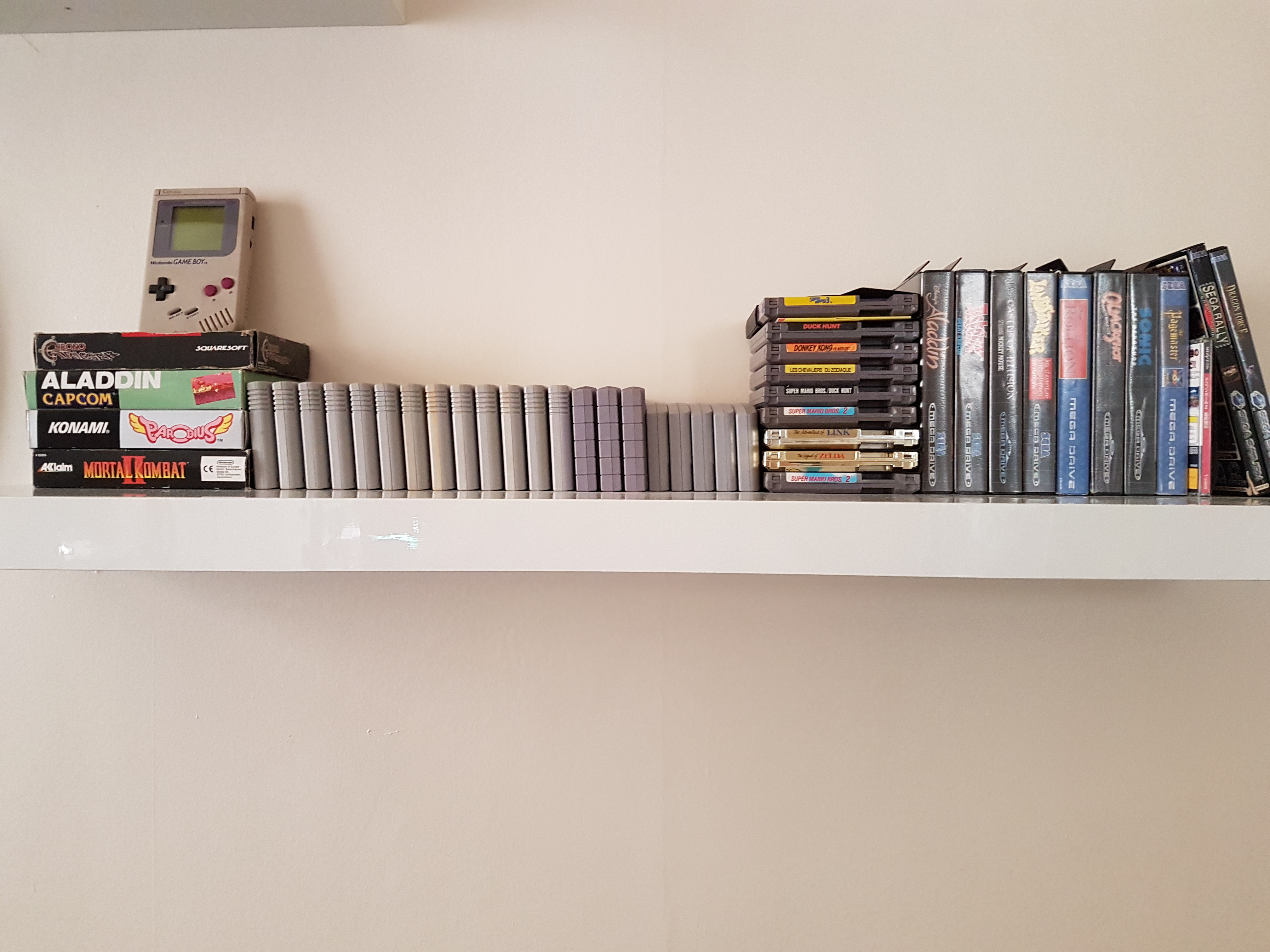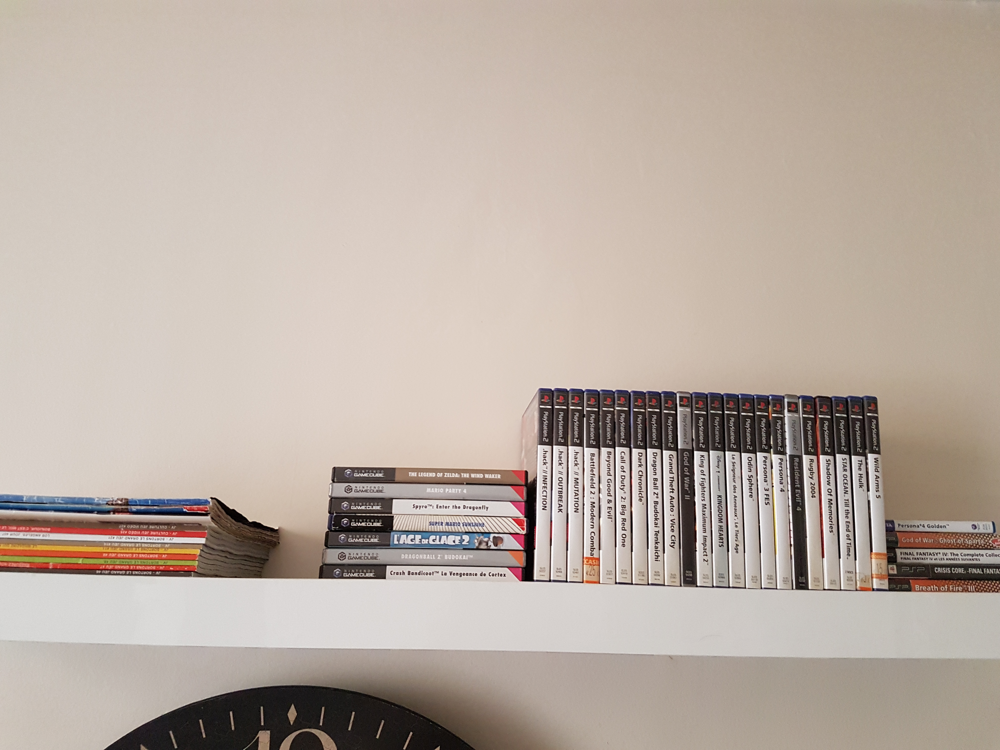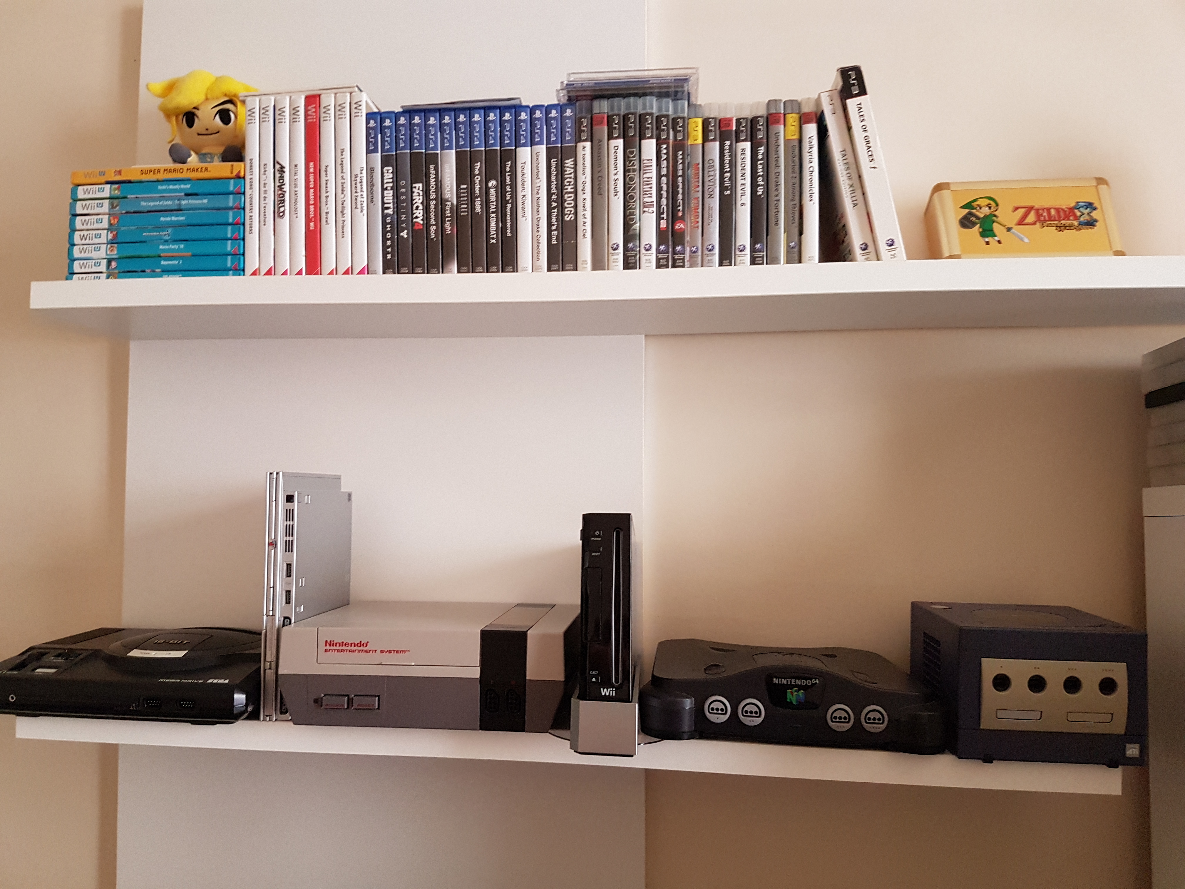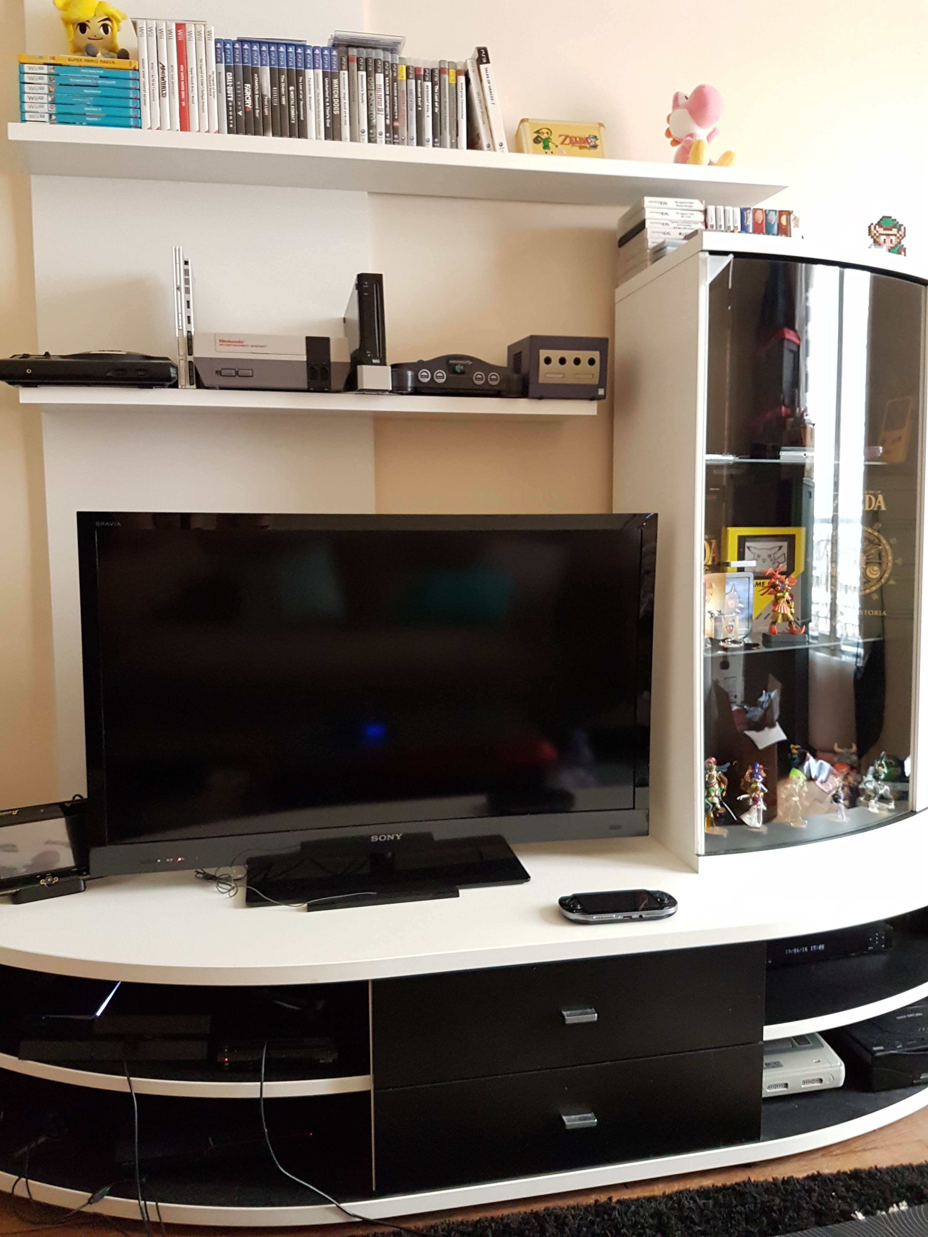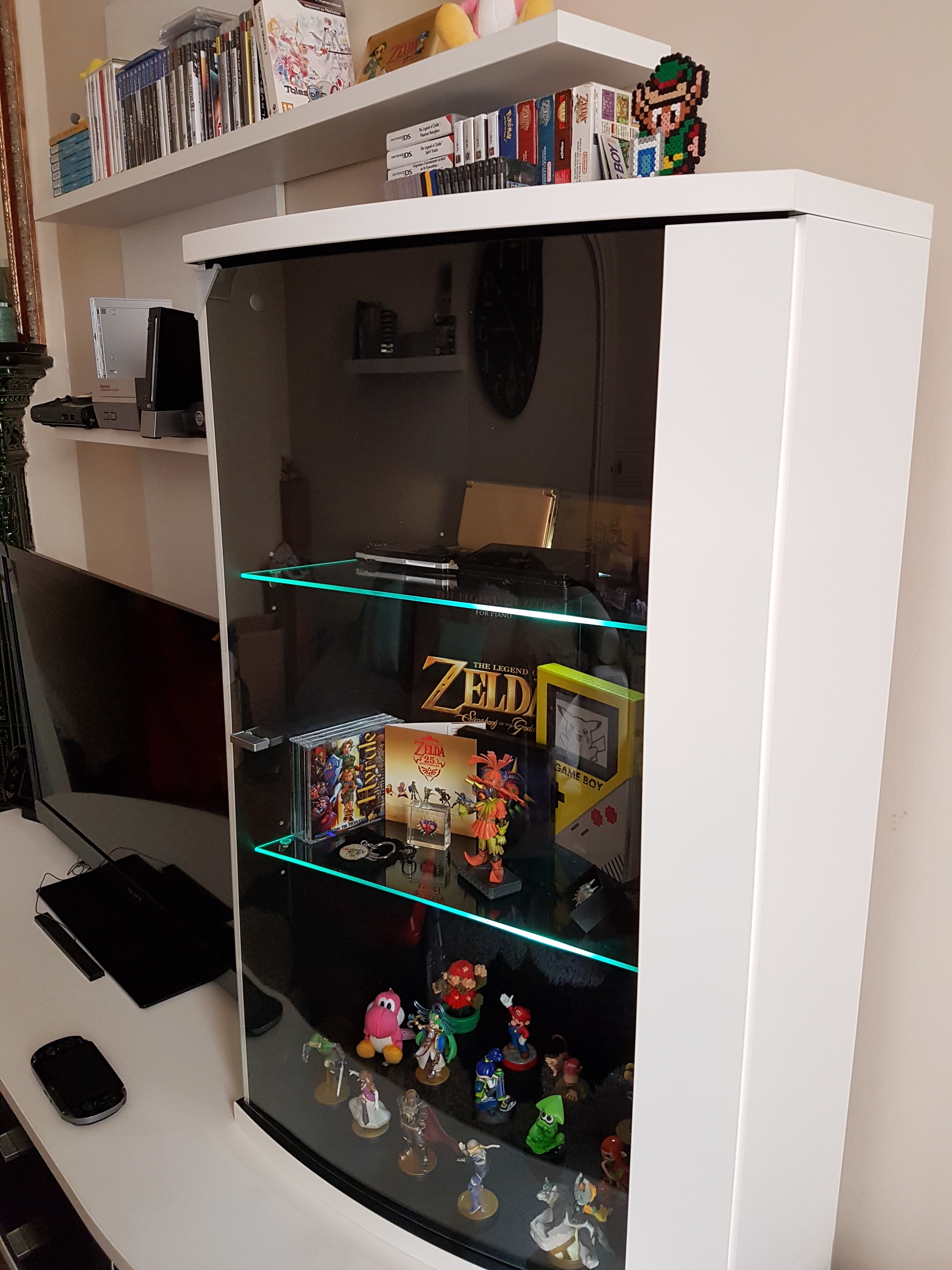 Du coup j’ai trouvé l’idée sympathique de vous montrer un peu ce que cela donnait. Parce que pour la première fois de ma vie, mes jeux et consoles sont accessibles ou exposés, et non rangés dans des cartons. J’avais même à disposition un magnifique meuble TV avec vitrine pour exposer mes collectors et amiibo. Le rêve quoi.