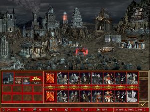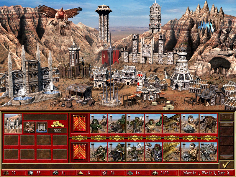 Au début de la partie, vous choisissez quel type de château vous souhaitez construire au fur et à mesure du déroulement du jeu. Il y a le choix, avec pas moins de 9 types de villes, chacune ayant ses spécificités et proposant un type de créatures différentes pour composer ses armées ultérieurement. A chaque tour, on a la possibilité d’y construire un nouveau bâtiment. L’intérêt est de faire des choix judicieux, pour savoir si l’on développe en priorité sa puissance militaire et magique ou sa prospérité économique, sachant que de toute façon l’un et l’autre sont étroitement liés, puisque engager des armées coûte de l’or, mais qu’une armée conquérante en rapporte.